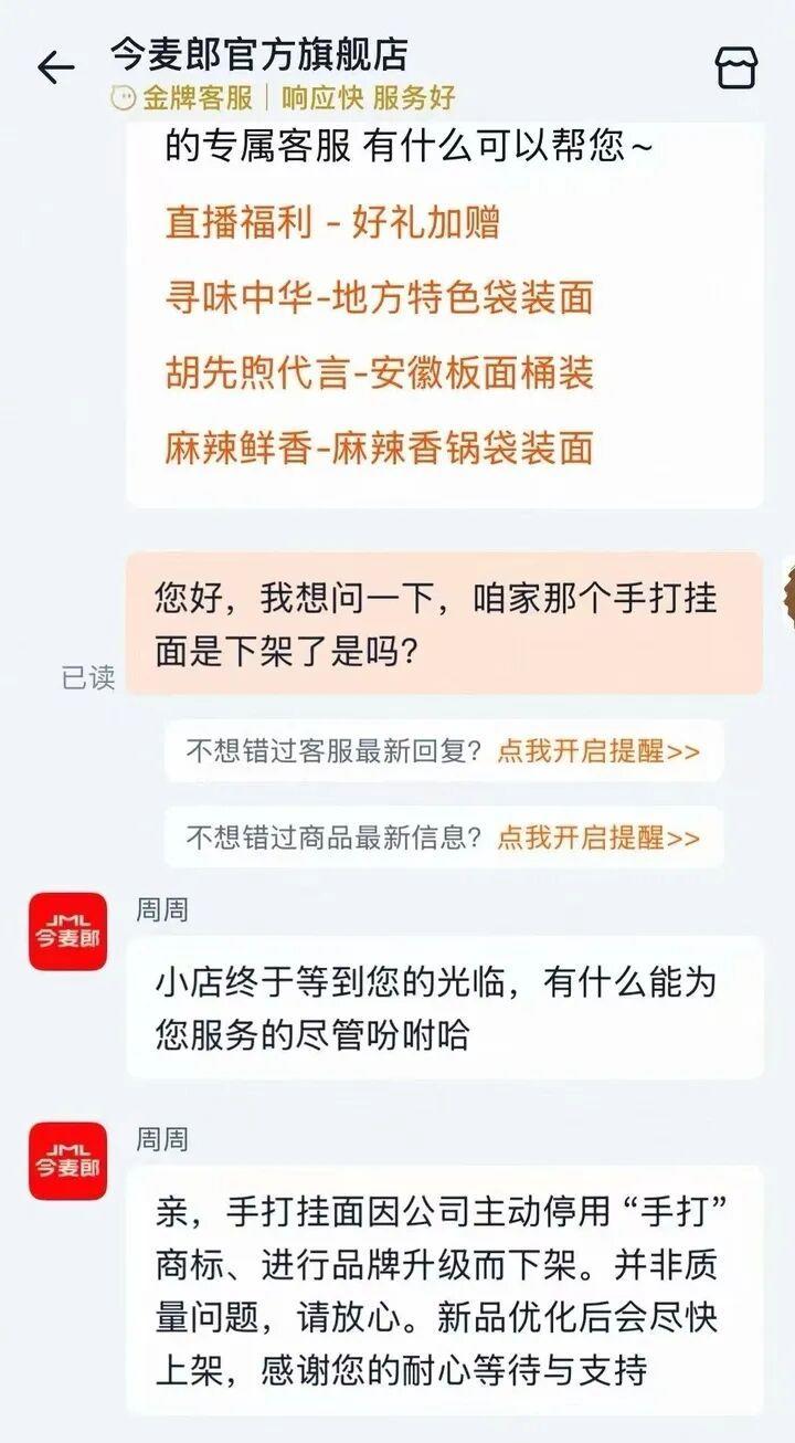 4月2日,记者在淘宝、京东等今麦郎官方旗舰店上查找“手打挂面”商品,平台多家官方旗舰店显示均无“手打挂面”在售,在今麦郎旗舰店内搜索相关“手打”关键词也并没有出现任何相关商品链接,随后记者联系旗舰店官方客服,客服也明确表示“手打挂面因公司主动停用‘手打’商标,进行品牌升级而下架”。