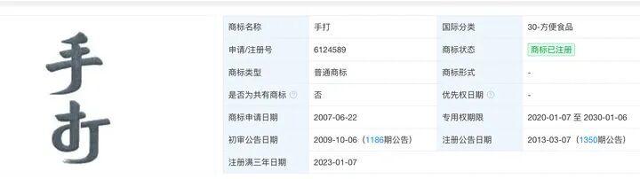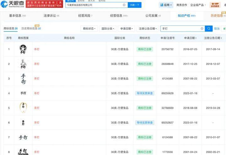 天眼查知识产权信息显示,2001年至2018年,今麦郎食品股份有限公司注册了多个“手打”字样的商标,均属于方便食品系列。涉事“手打挂面”所用商标专用权期限为2020年1月7日至2030年1月6日。此外,商标信息显示今麦郎食品股份有限公司“手打”“手打面”“手打鲜粉”等商标曾被驳回,国际分类均为方便食品。
