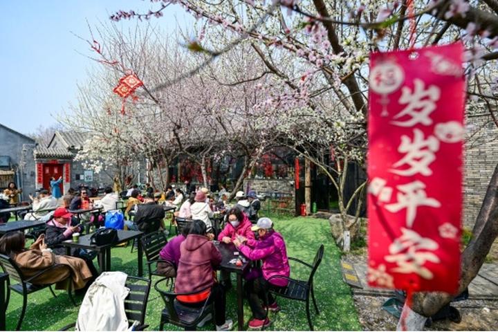 3月23日,游客在北京三里河公园一家饮品茶点店消费休闲。陈晔华摄(新华社)