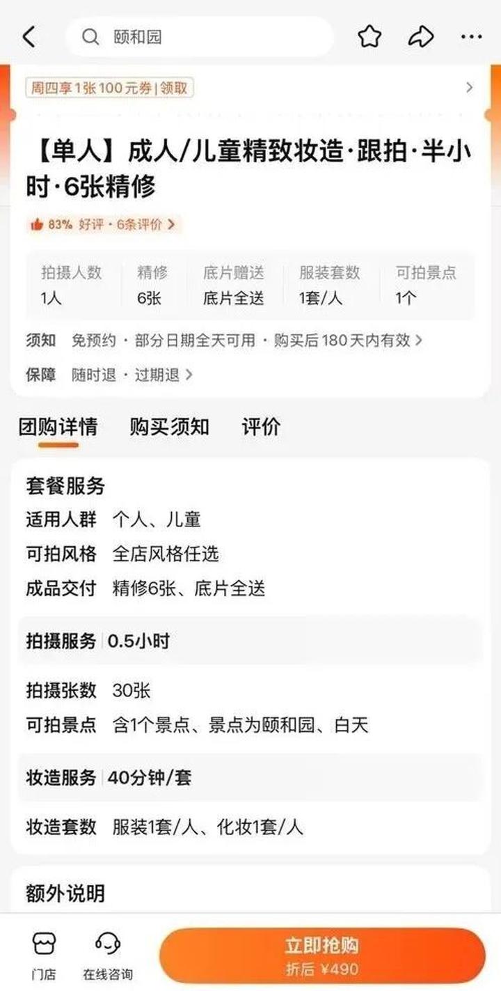 早在2023年,颐和园就曾公开表示,未经批准,禁止跟拍等商业拍摄。但记者在颐和园门外看到,地铁西苑站旁两公里内约有20户商家,明确表示可以提供进颐和园的商拍服务,在网络平台的团购上还专门注明仅用于颐和园。在一家网络平台上,某商户上架的半小时含妆造的商拍团购,今年已经售出200余单。