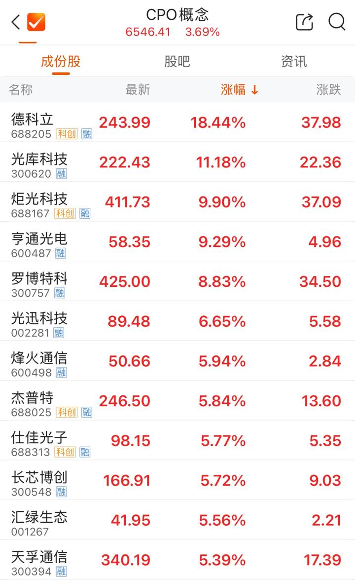 早盘,CPO概念活跃。德科立涨超18%,光库科技涨超11%,炬光科技、罗博特科等多股跟涨。消息面上,4月2日,工信部发布《关于开展普惠算力赋能中小企业发展专项行动的通知》。提出推动全光交换等技术应用部署,降低算力应用终端到服务器的网络时延,提升应用交互体验。