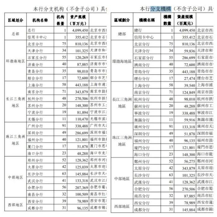 中新网记者对比两份公告发现,除北京分行、西安分行、悉尼分行、澳门分行等少数分支机构数据一致外,40家分支机构的资产规模出现较大出入。