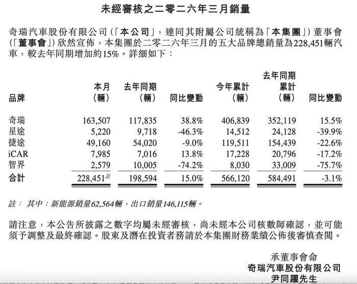 在问界高歌猛进的同时,同为鸿蒙智行生态内的另一关键品牌却面临严峻挑战。奇瑞汽车股份有限公司发布的《未经审核之二零二六年三月销量》公告显示,其与华为深度合作的“智界”品牌数据表现极为承压。