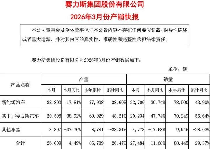 赛力斯集团股份有限公司最新发布的《2026年3月份产销快报》显示,作为鸿蒙智行绝对主力的“赛力斯汽车”(即AITO问界系列),依然保持着强劲的增长势头。