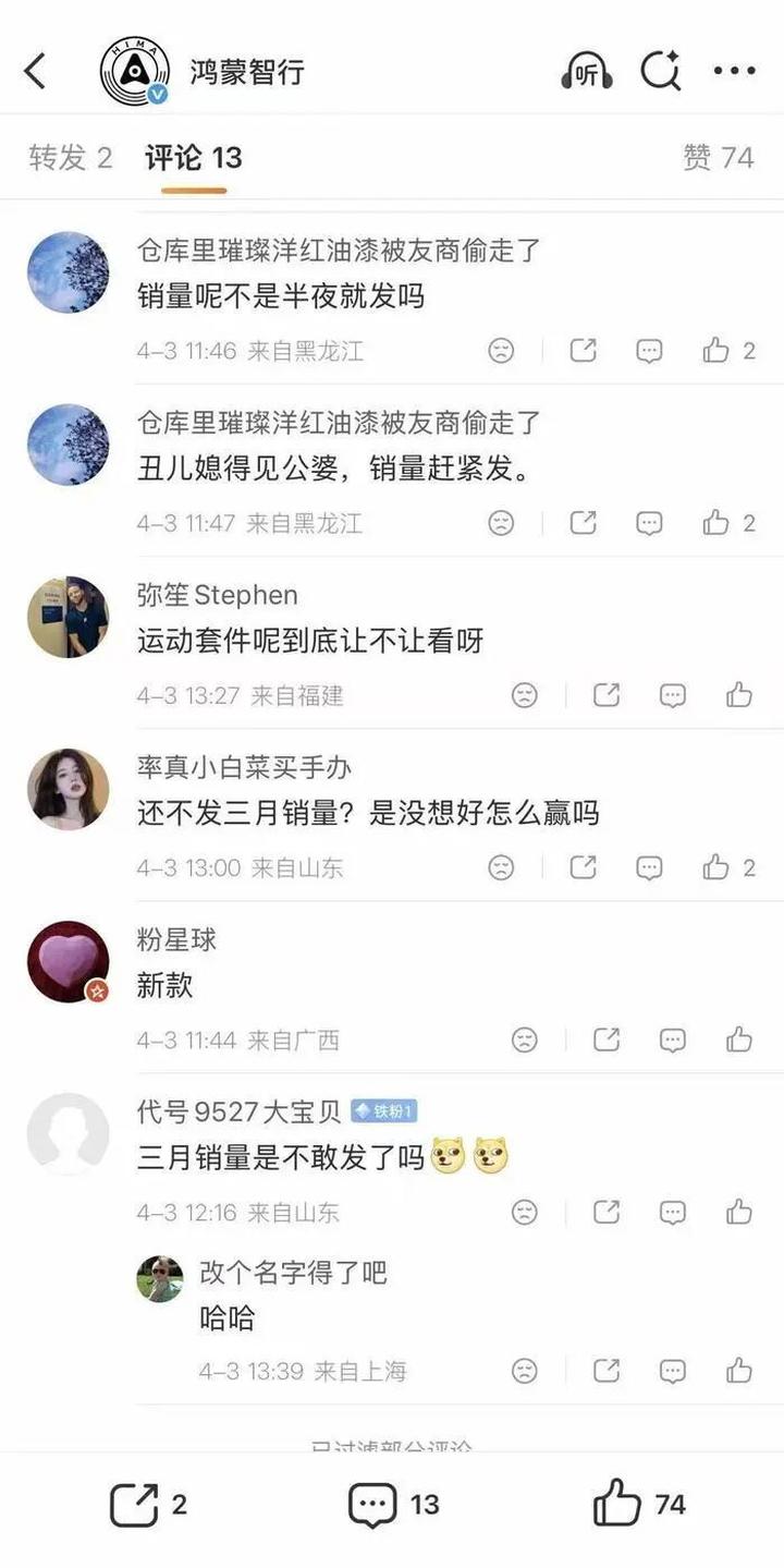 新黄河记者梳理官方微博发现,自2025年6月以来,鸿蒙智行基本保持在次月1日准时发布交付捷报,其间仅在公布2026年2月受春节影响的销量时,顺延至了3月2日发布。如今已至4月3日,官方整体数据依然未能出炉,此次长达数日的静默较为罕见,也引发了社交平台和车友圈的广泛猜测与追问。在鸿蒙智行官方微博的评论区,大量网友从4月2日起便开始密集催更。