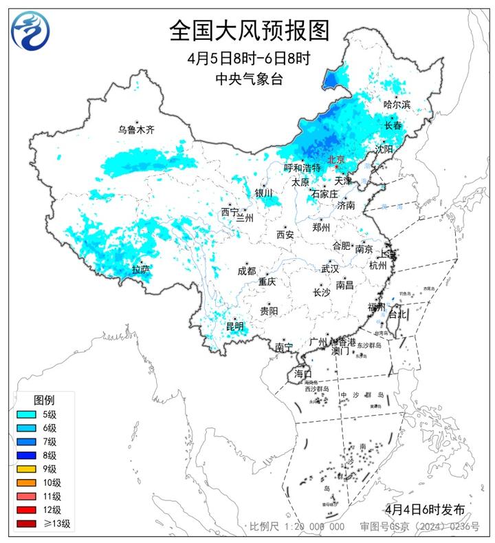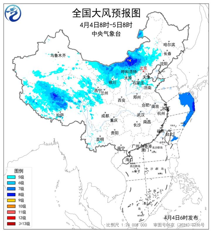 预计,4月4日8时至5日8时,内蒙古中西部、宁夏大部、山西北部、京津冀北部和南部、山东北部、新疆南部、青海中东部、西藏中西部、川西高原北部等地部分地区有5~7级风,阵风7~9级;其中,内蒙古中部局地阵风10级以上。东海东部海域、台湾以东洋面将有7~8级风、阵风9级。
