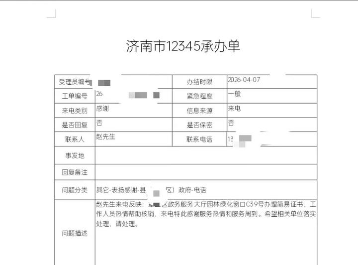 赵先生在来电中说道,在园林绿化窗口办理检疫证书相关业务时,全程服务贴心又高效,彻底解决了自己的办事难题,这份暖心的服务让他倍感舒心,特意通过热线来电表达感谢。