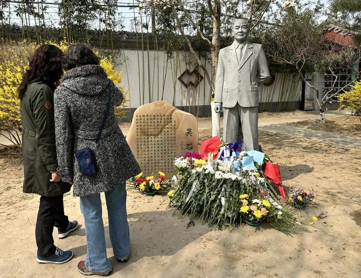 吴石将军雕像位于公墓西门一株盛放的玉兰树下,四周苍松翠竹掩映,一旁的石碑镌刻着将军的生平事迹。将军雕像面朝宝岛台湾的方向,脚下摆满了市民敬献的鲜花。“青山埋忠骨,热血祭英雄”——在一束鲜花上,有市民留下这样的诗句。