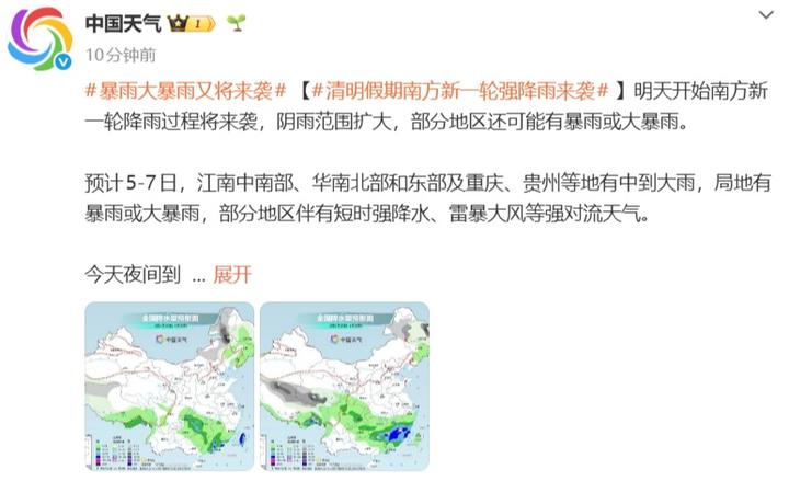 据@中国天气 5日开始南方新一轮降雨过程将来袭,阴雨范围扩大,部分地区还可能有暴雨或大暴雨。
