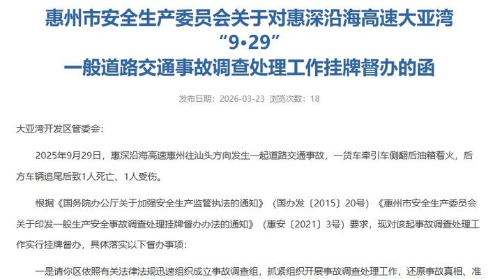 2026年3月23日,惠州市应急管理局在其官网发布了《惠州市安全生产委员会关于对惠深沿海高速大亚湾“9·29”一般道路交通事故调查处理工作挂牌督办的函》。