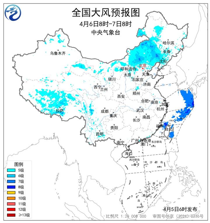 6日8时至7日8时,内蒙古中东部、山西北部、河北北部、辽宁大部、吉林南部、新疆北部、甘肃西部、青海南部、西藏中部、川西高原、云南南部等地部分地区有5~7级风,阵风7~9级。台湾以东洋面、东海东部海域将有7~8级、阵风9级的大风。