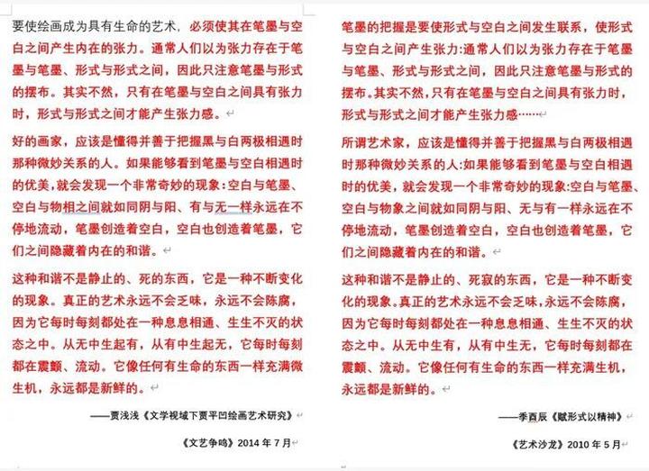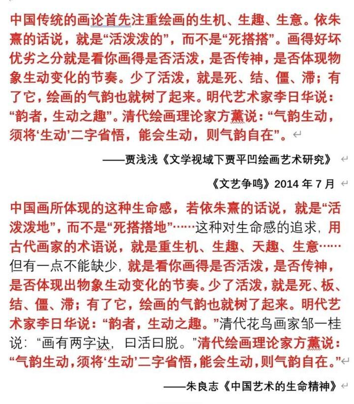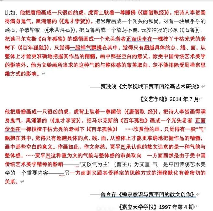 据“抒情的森林”所发帖文,贾浅浅的另一篇学术论文《文学视域下贾平凹绘画艺术研究》中,有多处、相当篇幅的内容来自他处。其中,关于中国传统的画论的一段描述,来自朱良志的书作《中国艺术的生命精神》;关于笔墨张力的描述,则是来自季酉辰的文章《赋形式以精神》;关于贾平凹绘画气韵和审美的描述,来自曾令存的《禅宗意识与贾平凹的散文创作》;关于中国绘画三个阶段的描述,来自韩羽曾刊发于《美文》的文章《自己与自己斗,其乐无穷——答友人问》。