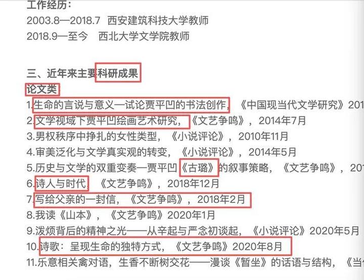 据资料介绍,贾浅浅目前为西北大学文学院副教授。西北大学文学院官网上,贾浅浅近年主要科研成果介绍也存在错误信息,比如将贾平凹的《古炉》写成了《古璐》,比如列入论文类并注明刊发于《文艺争鸣》的《写给父亲的一封信》,其实是刊发于《文艺报》一篇小文《读父亲信有感》。