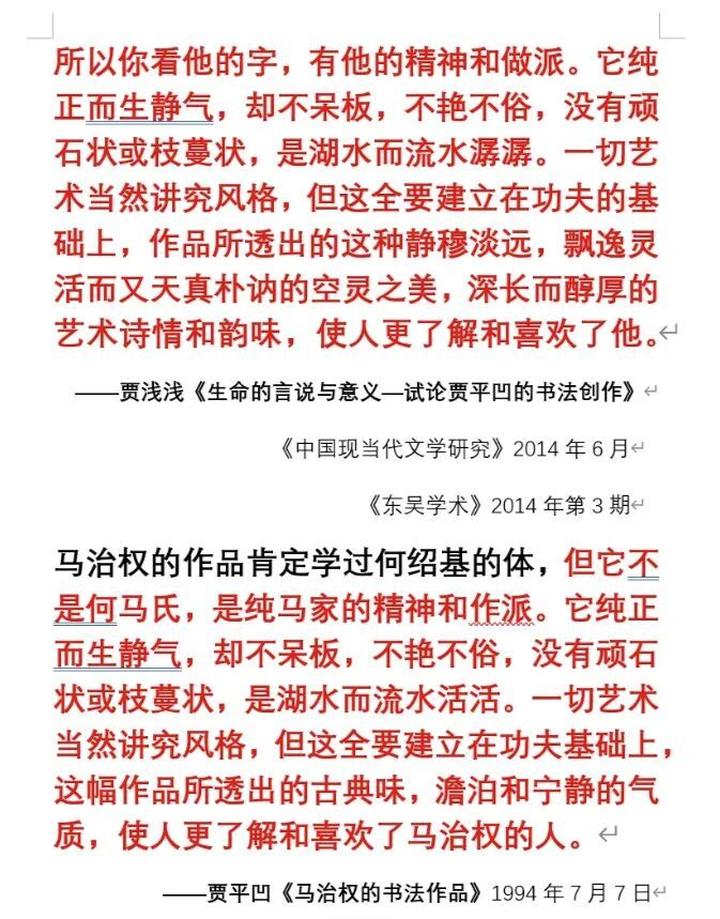 据“抒情的森林”所发帖文,贾浅浅的学术论文《生命的言说与意义——试论贾平凹的书法创作》中,其关于贾平凹书法艺术风格的一段描写,直接复制了贾平凹早先对马治权书法作品的评价,其中仅仅修改了个别词语。