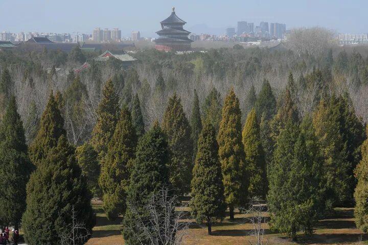 大风吹拂下,北京天坛公园上空弥漫着花粉雾,公园开启草地喷灌设施应对。新华社记者 鞠焕宗 摄
