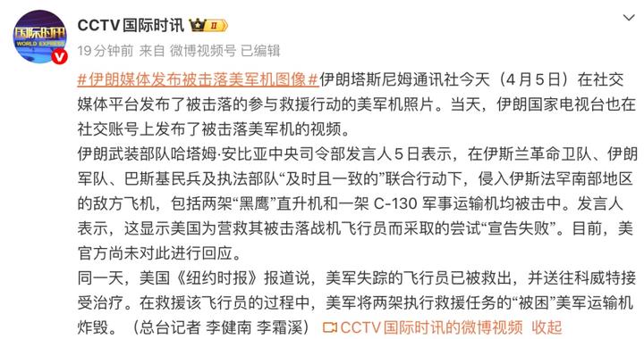 伊朗塔斯尼姆通讯社今天(4月5日)在社交媒体平台发布了被击落的参与救援行动的美军机照片。当天,伊朗国家电视台也在社交账号上发布了被击落美军机的视频。