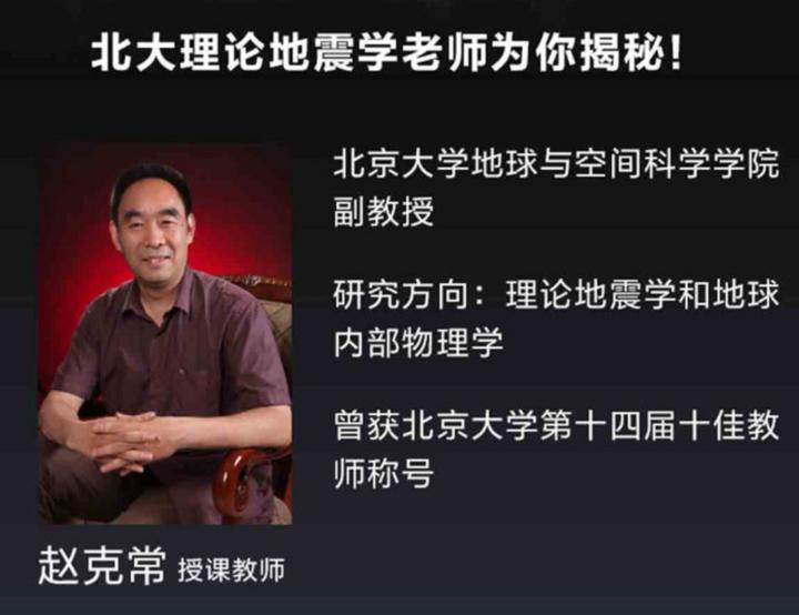 据北大课堂网站介绍,赵克常是北京大学地球与空间科学学院副教授,研究方向是理论地震学和地球内部物理学,曾获北京大学第十四届十佳教师称号。