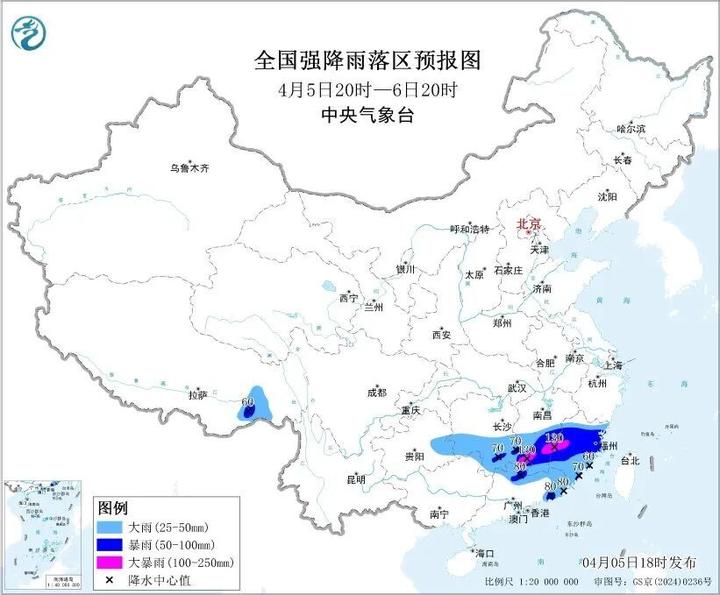 中央气象台4月5日18时发布暴雨蓝色预警: