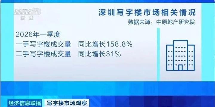 数据显示,2026年一季度,深圳一手写字楼成交量,同比增长158.8%;二手写字楼成交量,同比增长31%。
