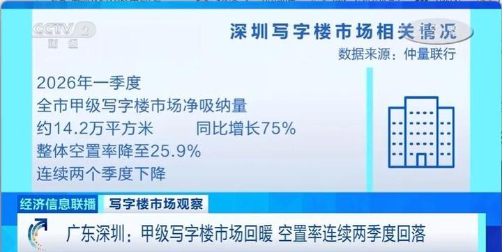 刚刚过去的一季度,广东深圳写字楼的租赁需求迎来回暖。甲级写字楼空置率连续两个季度回落。数据显示,2026年一季度,深圳一手写字楼成交量,同比增长158.8%;二手写字楼成交量,同比增长31%。