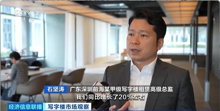 广东深圳前海某甲级写字楼租赁高级总监 石坚涛:整体的租赁比去年第一季度增长了20%左右,一季度成交了1万多平方米。大约50%的成交是以科技类为主,大约30%是金融业,20%是专业服务业。