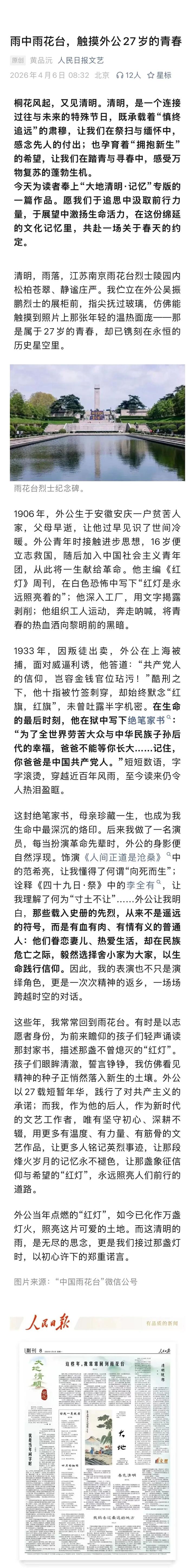 4月6日出版的《人民日报》,刊发演员黄品沅的署名文章《这些年,我常常回到雨花台》,讲述了他的外公、曾任中共中央巡视员的吴振鹏烈士的故事。
