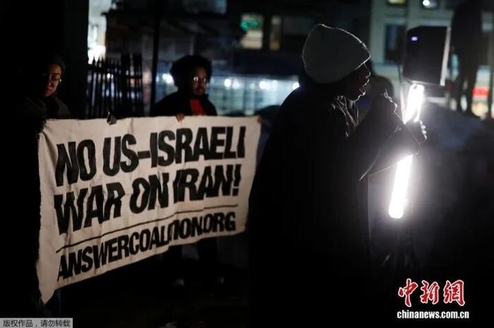 资料图:当地时间3月2日,民众在波士顿集会,反对美国和以色列对伊朗发起军事行动。图为集会现场画面。