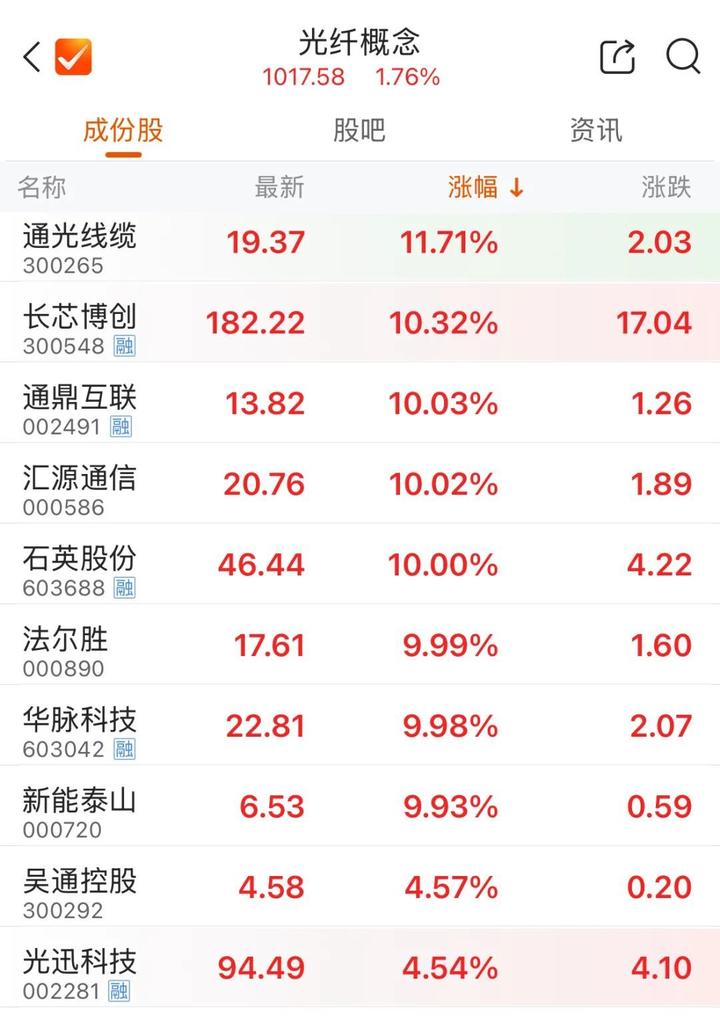 此外,光纤概念反复走强。汇源通信3连板,通鼎互联、石英股份等多股涨停,通光线缆、长芯博创等涨幅靠前。