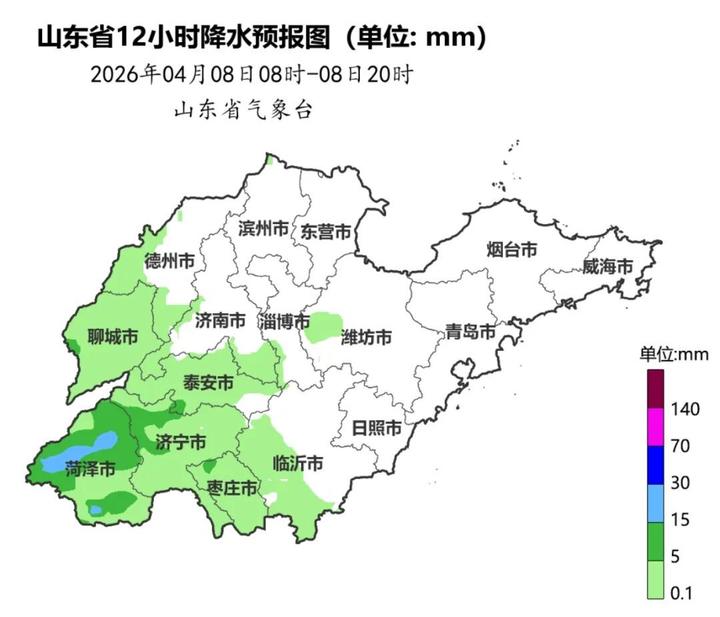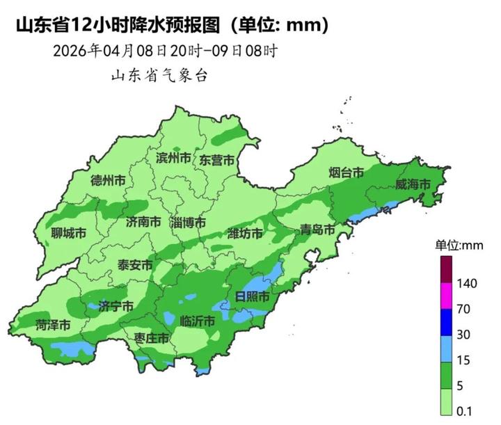 8日白天到夜间,全省天气多云转阴,鲁南和半岛地区有小到中雨并伴有雷电,其他地区有小雨。半岛地区南风5~6级阵风7~8级,临沂、日照和鲁中地区南风5~6级阵风7~8级转北风3~4级,其他地区南风4级阵风5~6级转北风3~4级,雷雨地区雷雨时阵风7~8级。