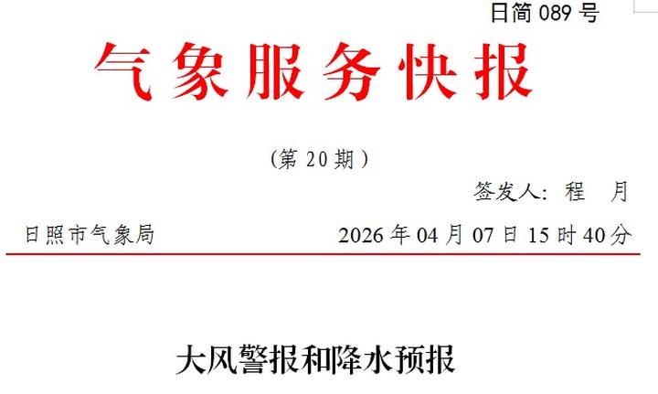 大风:日照市气象台4月7日15时40分发布大风警报。预计8日午后到9日早晨,全市东南风风力较强,最大风力陆上4~5级、阵风7级,沿海及近海海域5~6级、阵风7级,海上6~7级、阵风8级。
