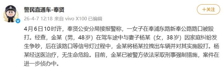 今天(4月7日),上海市公安局奉贤分局官方微博@警民直通车-奉贤 发布通报称: