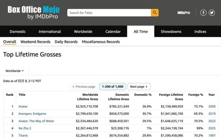 据票房数据网站BoxOfficeMojo统计,北京时间4月8日,《哪吒2》全球累计票房达到22.67亿美元,超过《泰坦尼克号》,成为全球影史票房第四的电影。