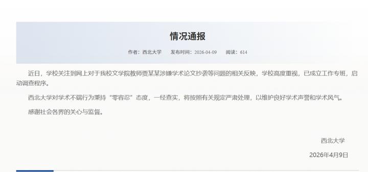 近日,学校关注到网上对于我校文学院教师贾某某涉嫌学术论文抄袭等问题的相关反映,学校高度重视,已成立工作专班,启动调查程序。