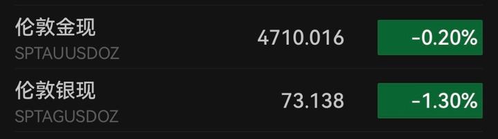 国际贵金属价格则不复昨日大涨趋势,伦敦金现、伦敦银现双双下跌。截至北京时间10时04分,伦敦金现跌0.2%,报4710.016美元/盎司,盘中一度跌破4700美元大关。伦敦银现开盘后震荡走低,跌1.3%,报73.138美元/盎司。