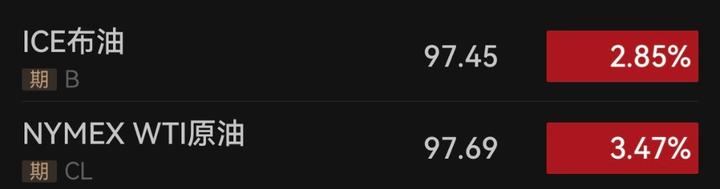 截至北京时间10时04分,WTI原油期货价格已涨3.47%,再次回归到95美元上方,报97.69美元/桶。布伦特原油期货价格开涨2.45%,随后一路走高,涨2.85%,报97.45美元/桶。