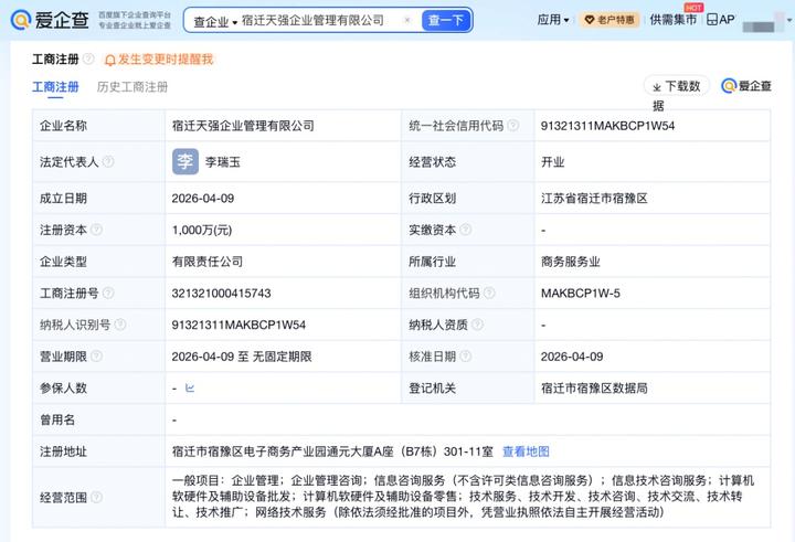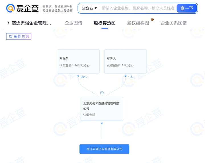 爱企查App显示,4月9日,宿迁天强企业管理有限公司成立,法定代表人为李瑞玉,注册资本为1000万元人民币,经营范围包括企业管理、信息技术咨询服务、计算机软硬件及辅助设备批发等。股权穿透图显示,该公司由北京天强坤泰投资管理有限公司全资持股,后者由刘强东、章泽天共同持股。
