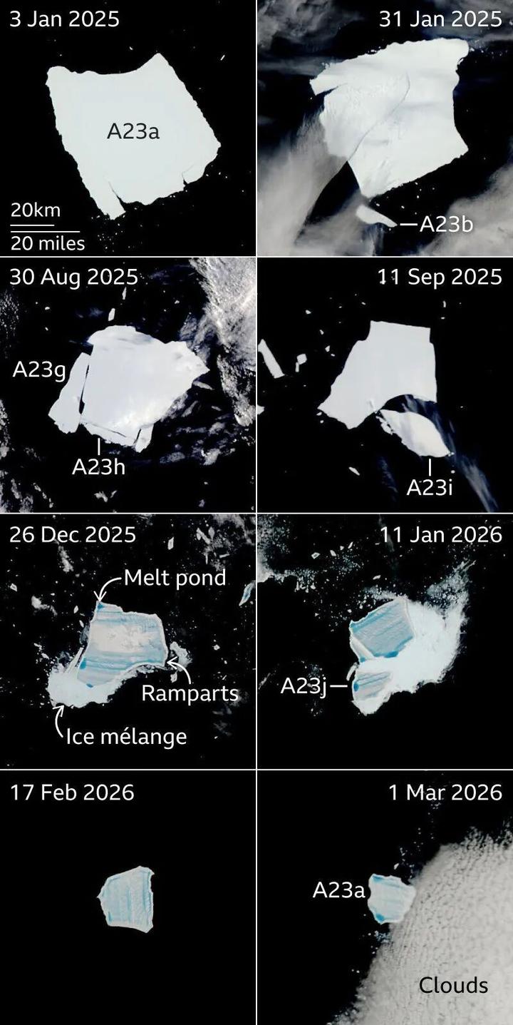 2026年1月,A23a再次发生崩解,其主体面积仅余503平方公里。