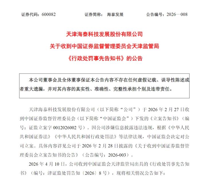 回溯来看,海泰发展于2026年2月27日收到证监会下发的《立案告知书》。因公司涉嫌信息披露违法违规,证监会决定对公司立案。
