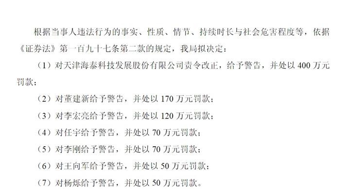 中国证监会天津监管局拟决定,对天津海泰科技发展股份有限公司责令改正,给予警告,并处以400万元罚款;对海泰发展时任董事长董建新等6名责任人给予警告,并合计罚款530万元。