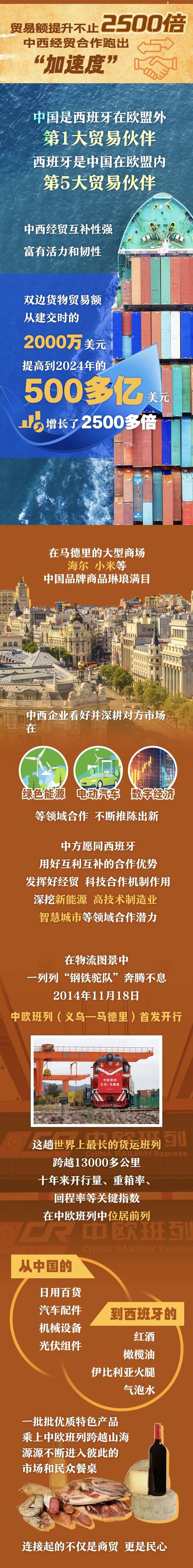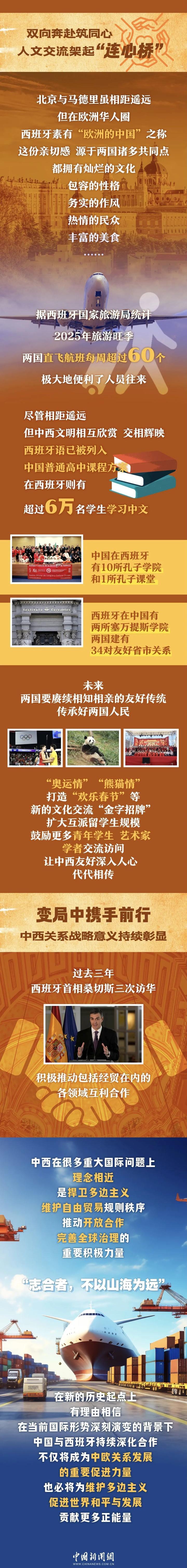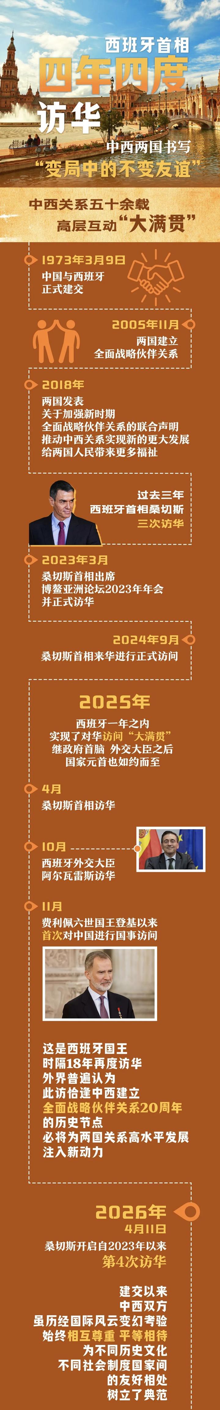 此访是桑切斯首相自2023年以来第四次到访中国。回望建交半个多世纪的历程,中西双方虽历经国际风云变幻考验,却始终相互尊重、平等相待,为不同历史文化、不同社会制度国家间的友好相处树立了典范,在变乱交织的国际局势中书写出不变的友谊篇章。一图了解中西关系的发展脉络与友好往来历程。