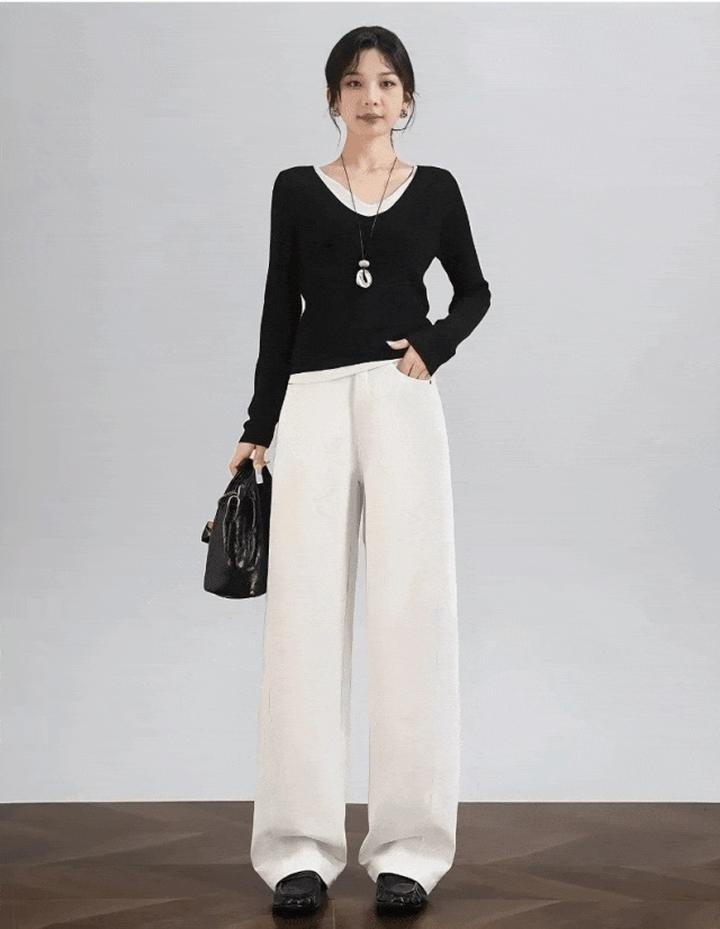 因为“弯”的弧度不夸张,所以这款裤子不容易压身高。