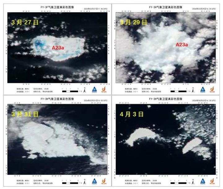 国家卫星气象中心(国家空间天气监测预警中心)国际用户服务中心首席专家郑照军介绍,从2022年末开始,风云气象卫星监测到A23a的7个明显变化时段:威德尔海加速漂移阶段(2022年末至2024年初),卷入海洋涡旋滞留(2024年3月至12月),南乔治亚岛西南大陆架搁浅(2025年3月至5月),重新漂移并大规模崩解(2025年6月至8月),灾难性大幅解体(2025年9月),瘦身后向低纬度漂移并显著融化(2025年10月至2026年1月),连续三次末期崩解至编号注销(2026年2月至4月)。