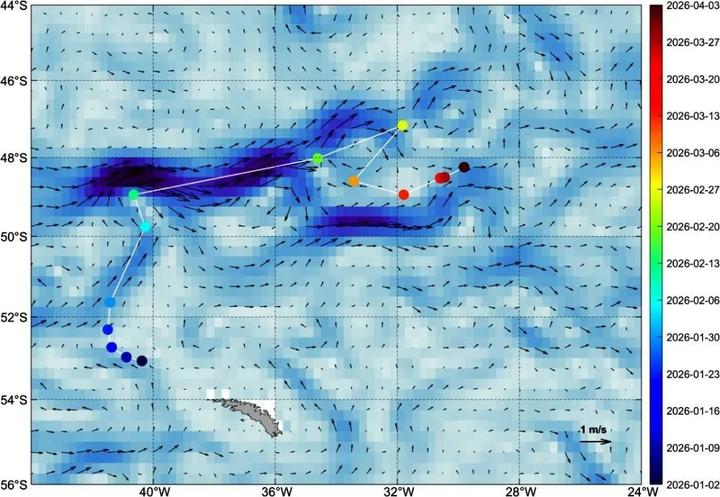 风云卫星监测的A23a冰山漂移路径(圆点为冰山位置,时间与右侧标注对应;图底色和箭头表示洋流)。(中国气象局供图)