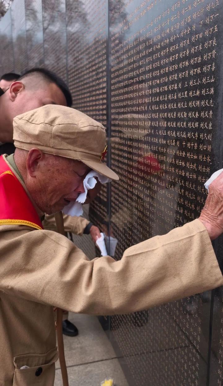 在陵园,三位抗美援朝志愿军老战士看到英名墙上的名字,一起敬了一个军礼。张志奎和叶秀福一人拿一个白手绢,一边流泪,一边反复擦拭战友的名字。