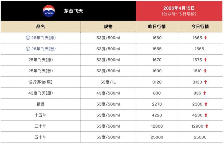 4月15日,26年飞天茅台原箱报1665元/瓶,较上一日上涨5元;26年飞天茅台散瓶报1565元/瓶,与上日价格持平。25年飞天茅台原箱报1675元/瓶,较上一日上涨5元;25年飞天茅台散瓶报1610元/瓶,较上一日上涨10元。