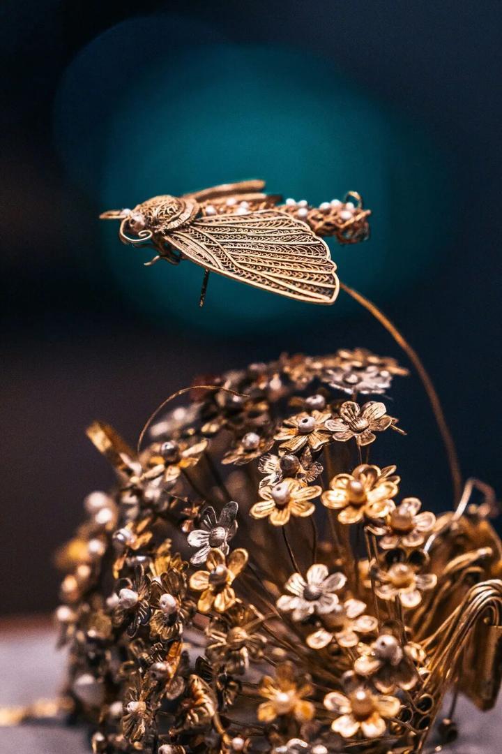 其中,闹蛾金钗是此次展览的重磅展品。隋代是金银钗簪的繁盛期,这件金钗以金片为托,六瓣形金花、穿孔小珍珠等组成花瓣,顶部立一只金丝嵌珍珠的飞蛾,体现“闹蛾扑花”的巧思,佩戴者行走时金钗轻微摇曳扇动,颇具动感。
