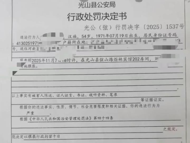 11月19日,光山县公安局以猥亵对刘某处以行政拘留10日的处罚。