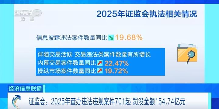 证监会4月17日发布了2025年执法情况综述,全年查办违法违规案件701起,罚没金额154.74亿元,142人被市场禁入,持续提升执法有效性和震慑力。