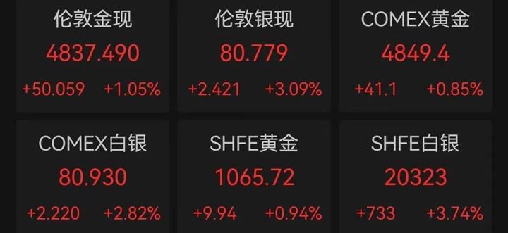 国际贵金属期货普遍收涨。COMEX黄金期货涨0.85%报4849.40美元/盎司,盘中一度冲上4900美元/盎司;COMEX白银期货涨2.82%报80.93美元/盎司,盘中一度超83美元/盎司。伦敦现货黄金涨1.05%报4837.49美元/盎司;伦敦现货白银涨3.09%报80.78美元/盎司。