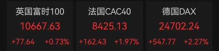 欧洲股市方面,英国富时100指数涨0.73%报10667.63点;德国DAX指数涨2.27%报24702.24点;法国CAC40指数涨1.97%报8425.13点。